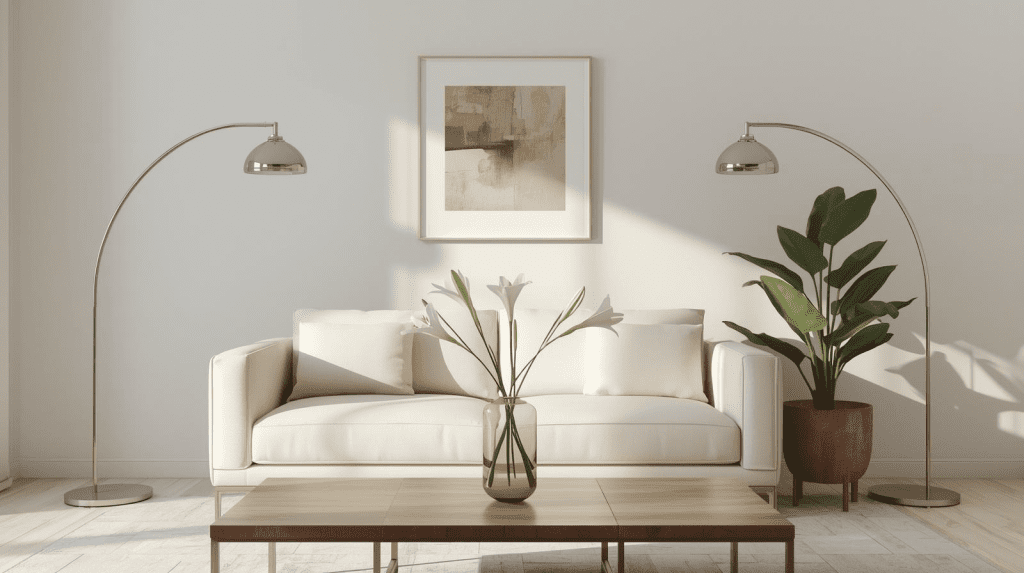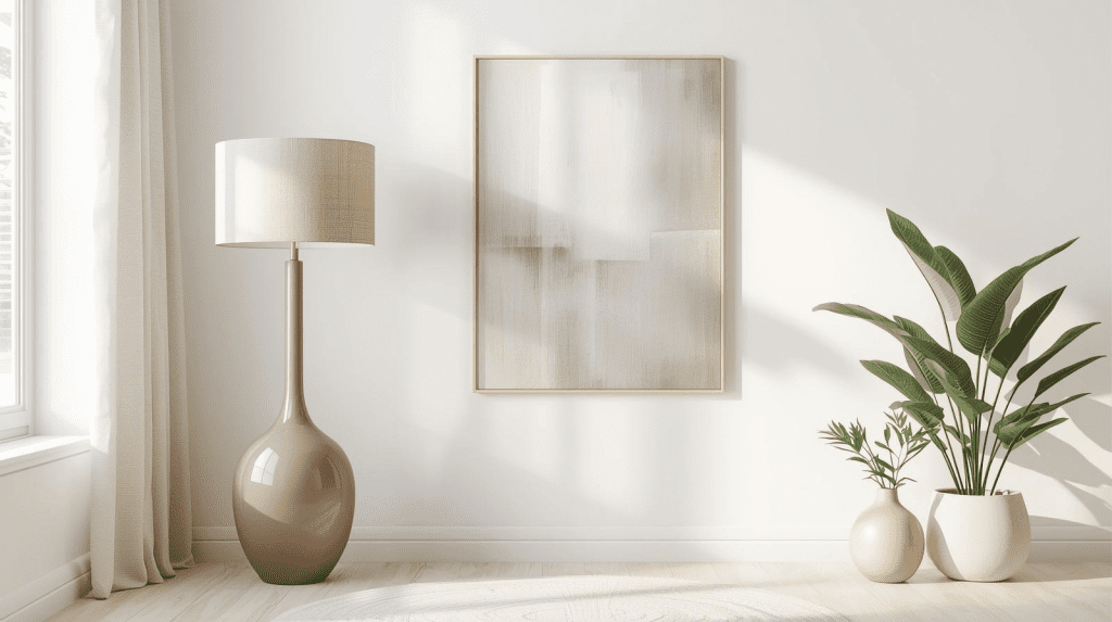 Anche in una casa neutra, i dettagli fanno la differenza. Lampade minimal, vasi eleganti, quadri semplici e piante verdi rendono gli ambienti più personali e accoglienti senza compromettere l’armonia cromatica.
