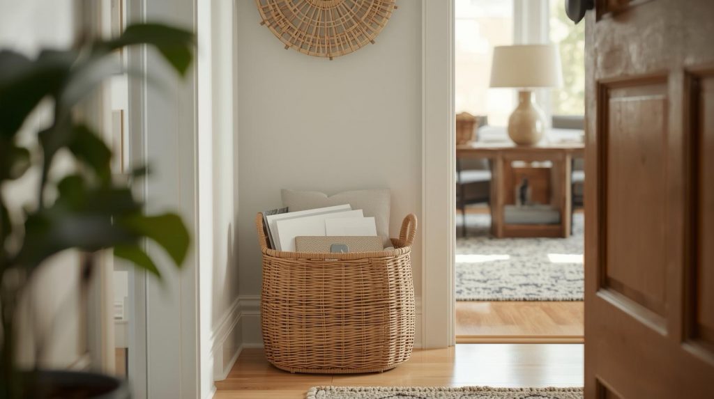 Posiziona un cestino nell’ingresso per raccogliere chiavi, posta e piccoli oggetti. Tieni un contenitore in bagno per raccogliere i prodotti che usi ogni giorno. In camera da letto, usa un cesto per i vestiti che non sono da lavare ma neanche da appendere di nuovo (perfetto per i “metto ancora una volta”).